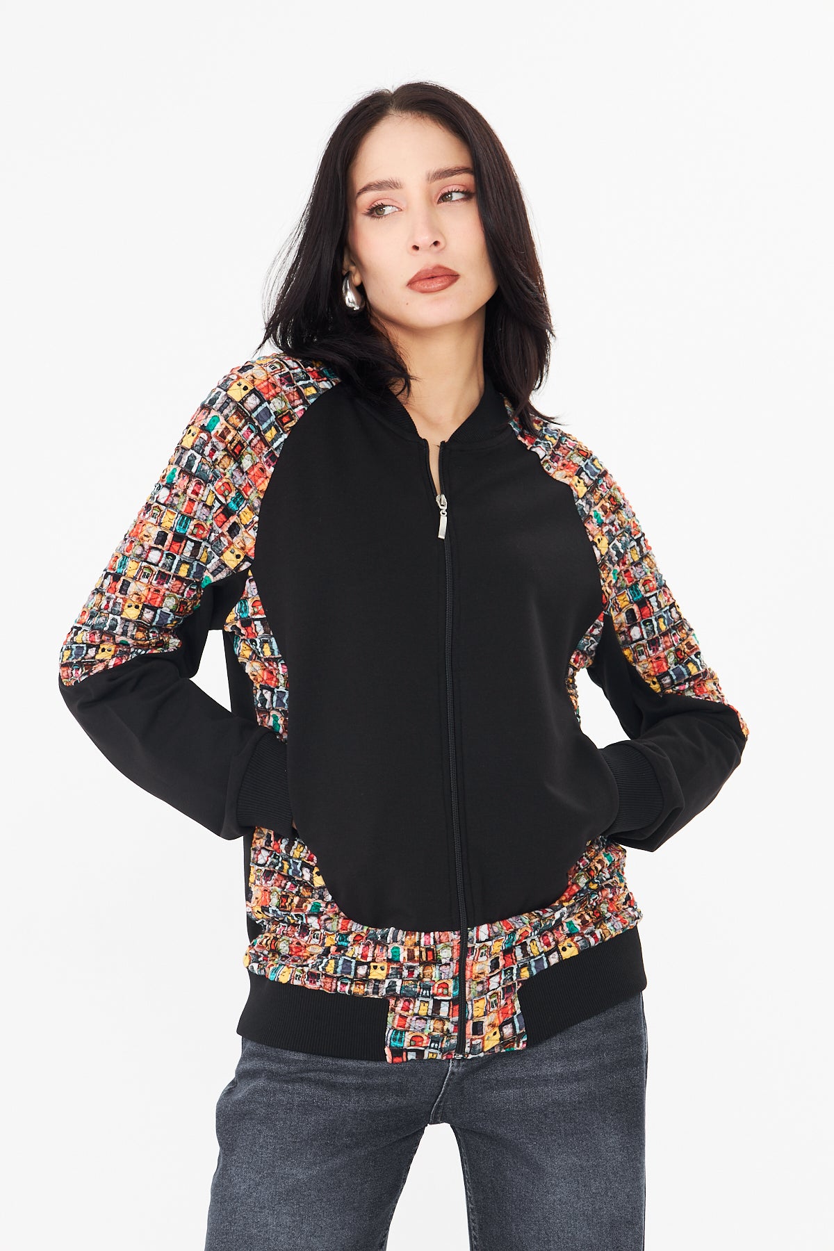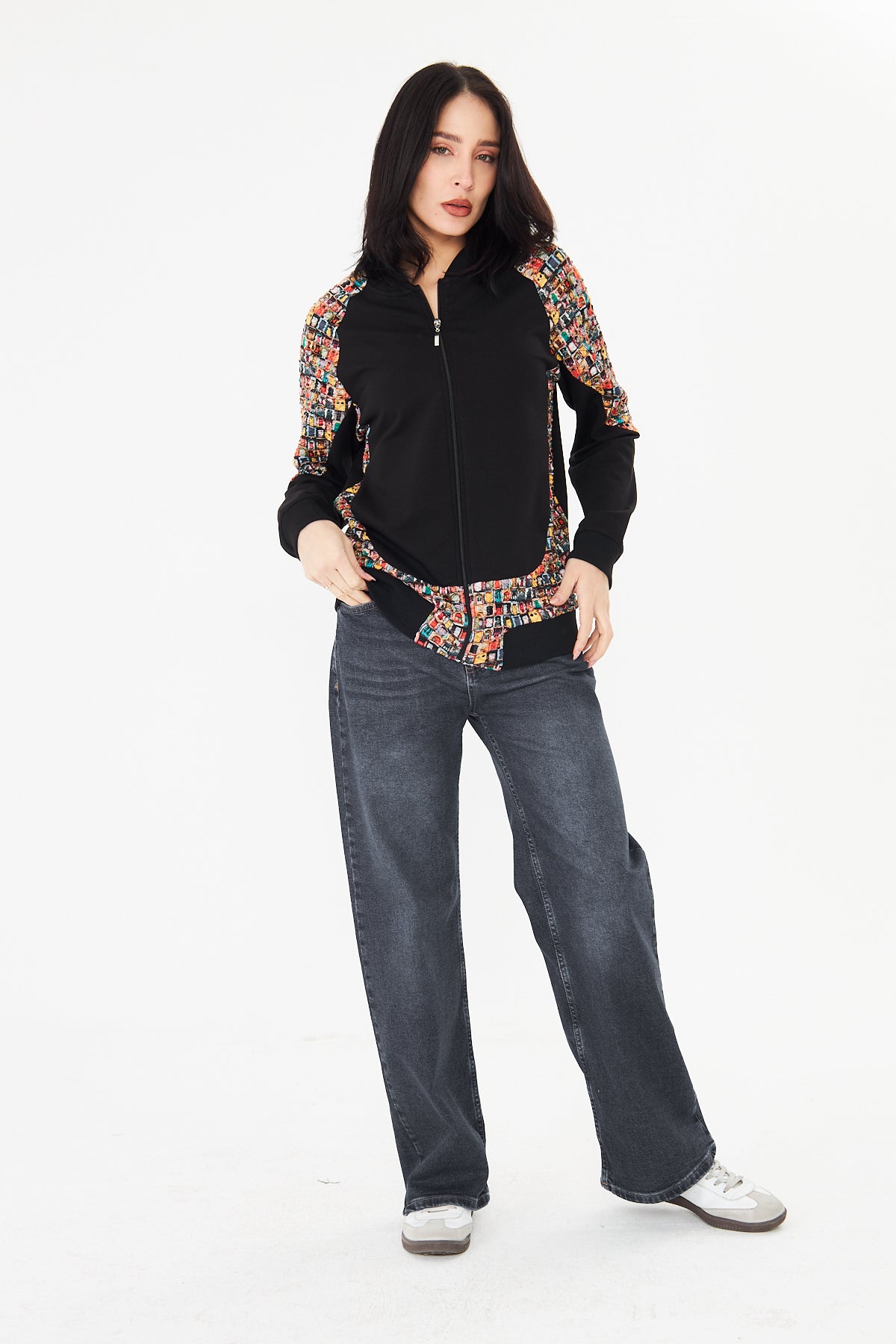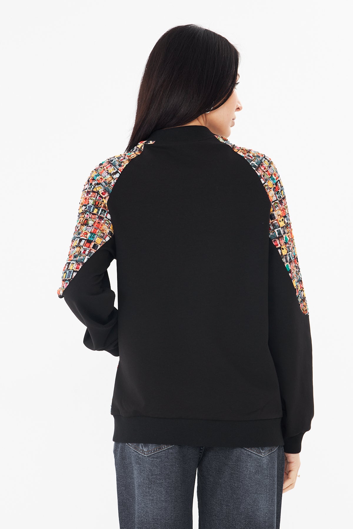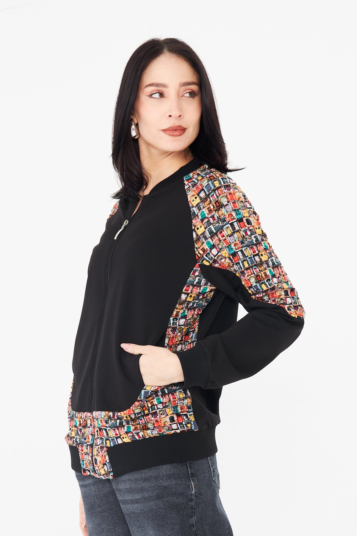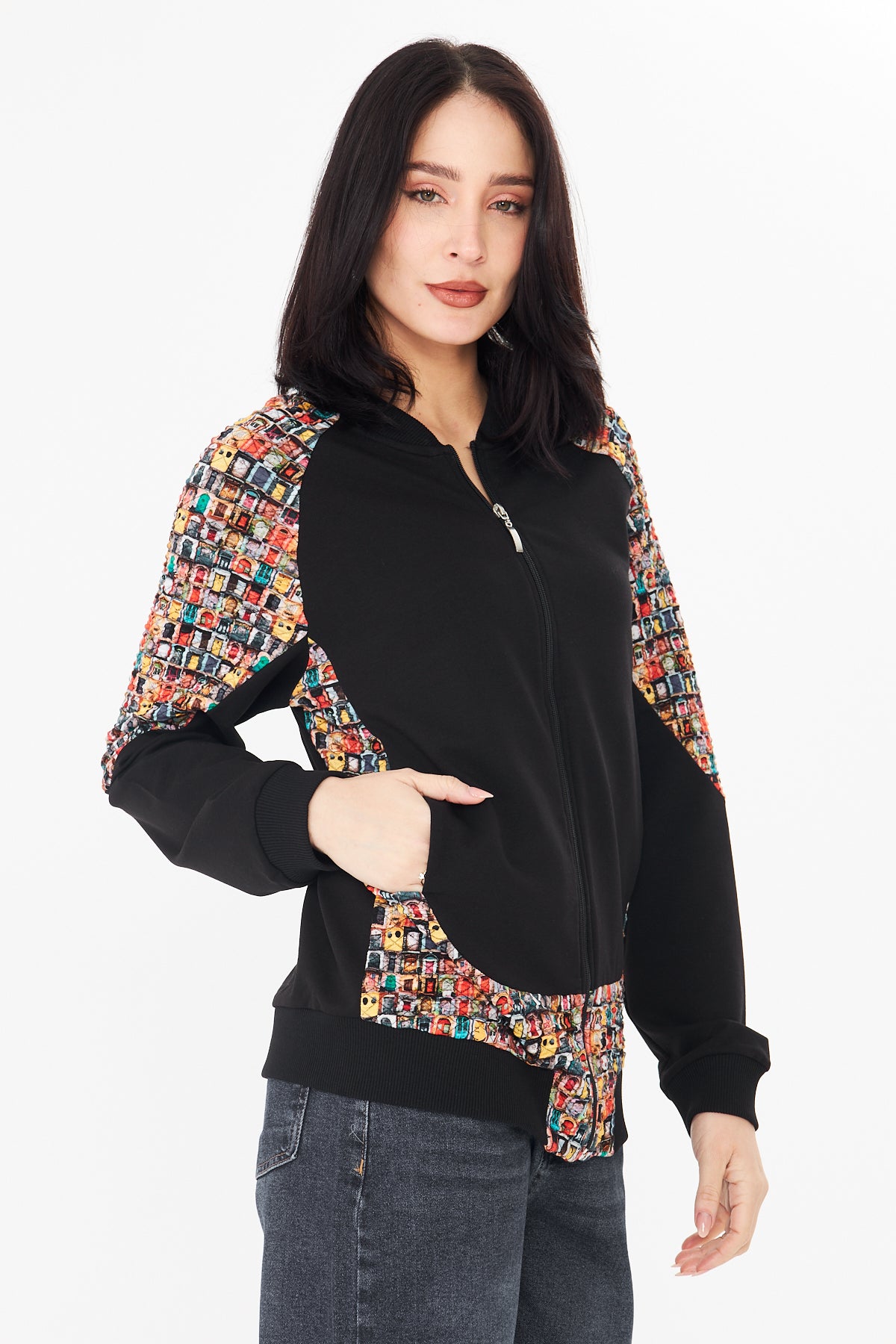 Kadın Fermuarlı Sweatshirt – Siyah / Desen Panelli