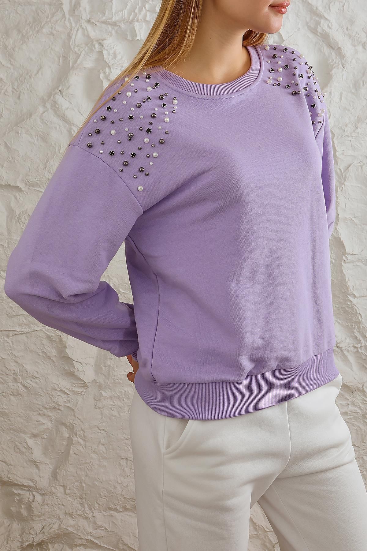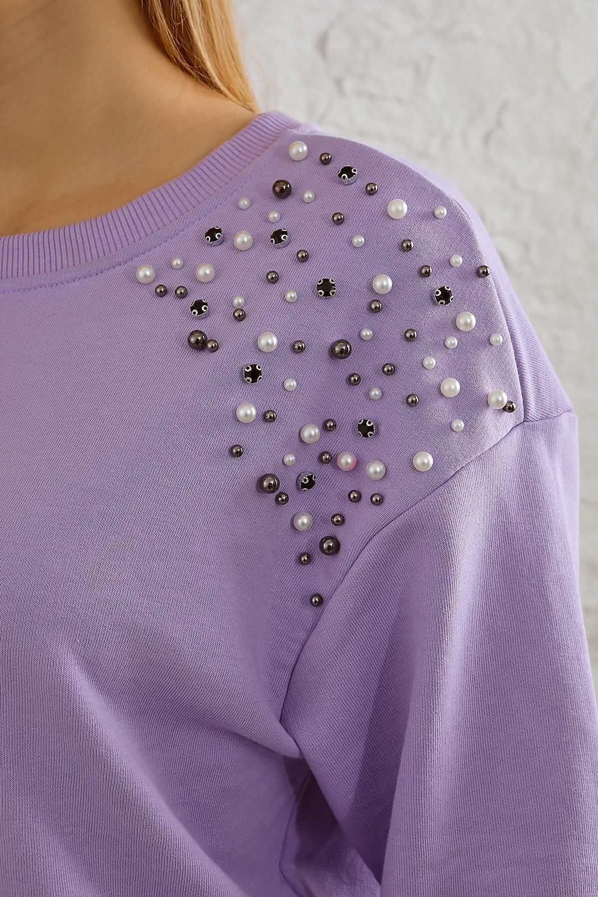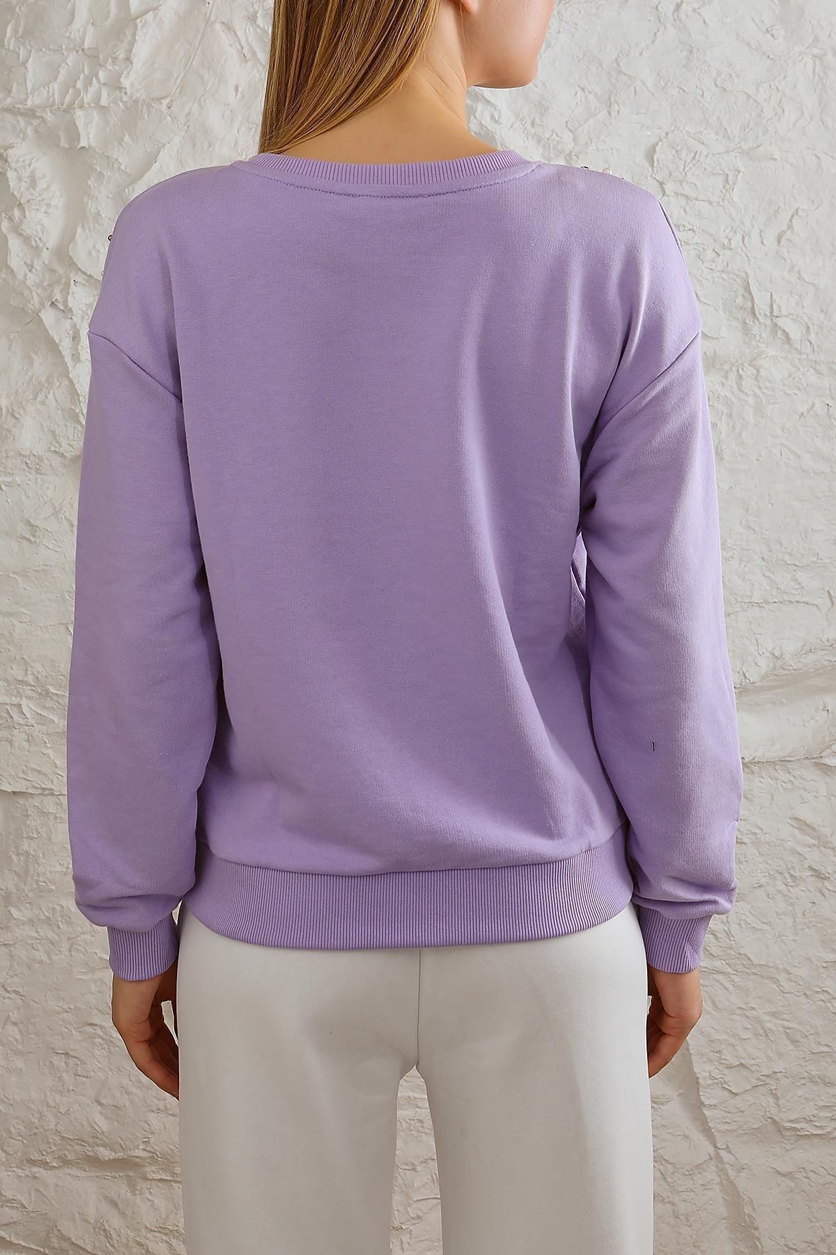 Kadın Rahat Kalıp Omuzları İnci Düğme Detaylı Sweatshirt