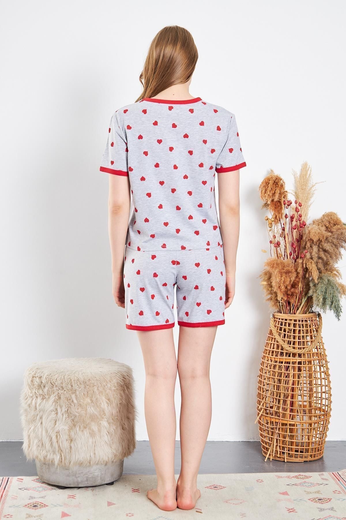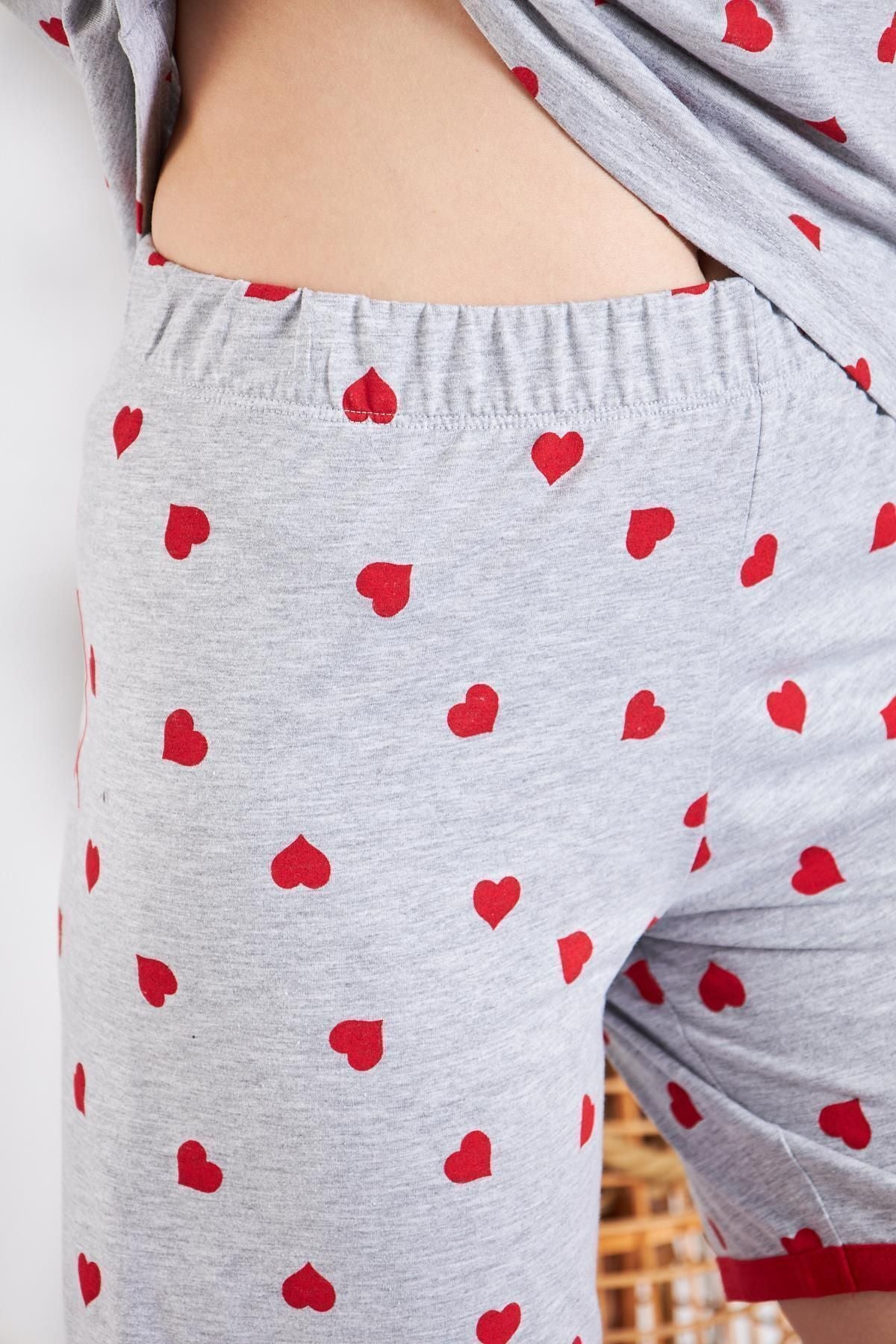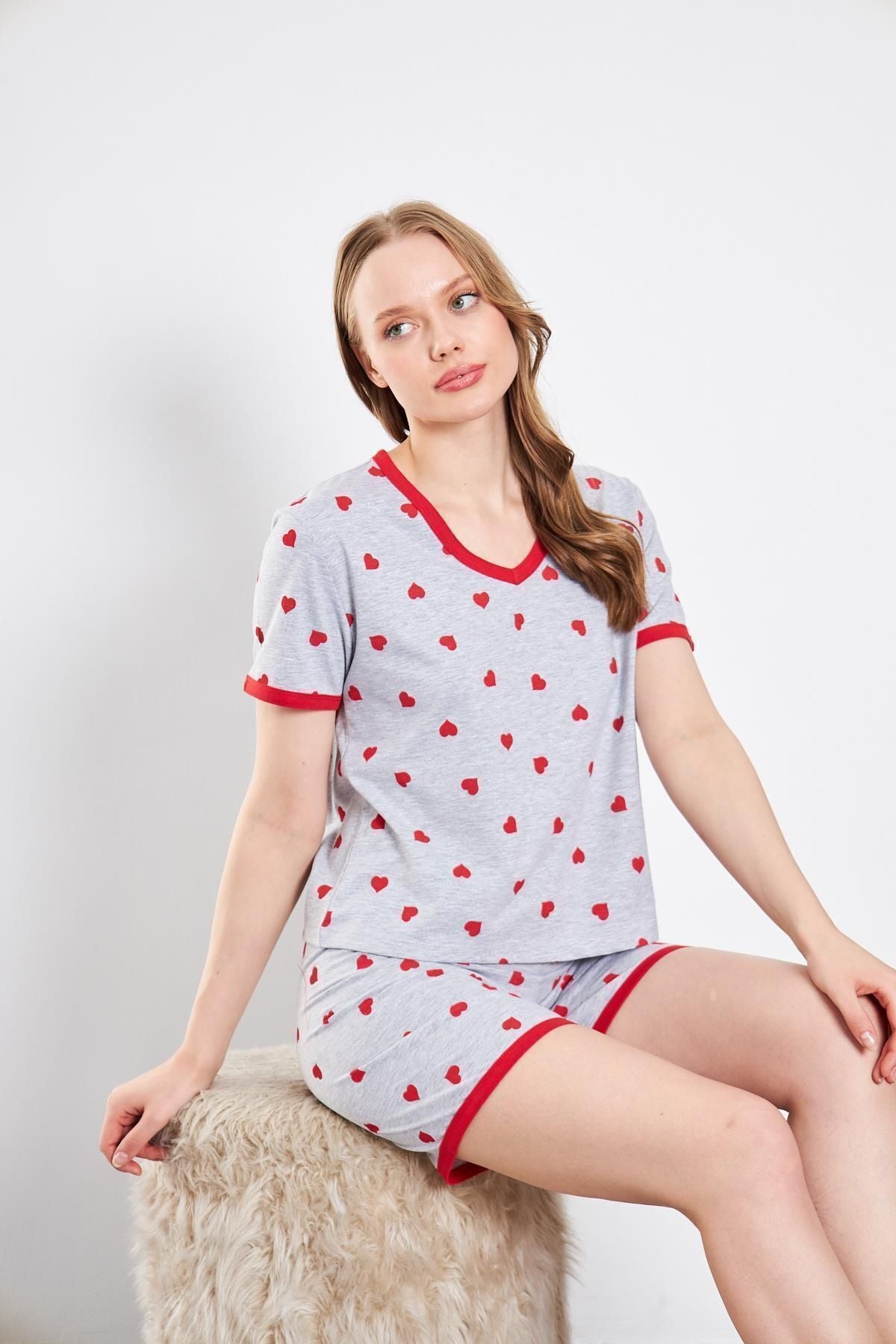 Kadın Pamuklu Örme Kırmızı Kalpli Şortlu Pijama Takımı