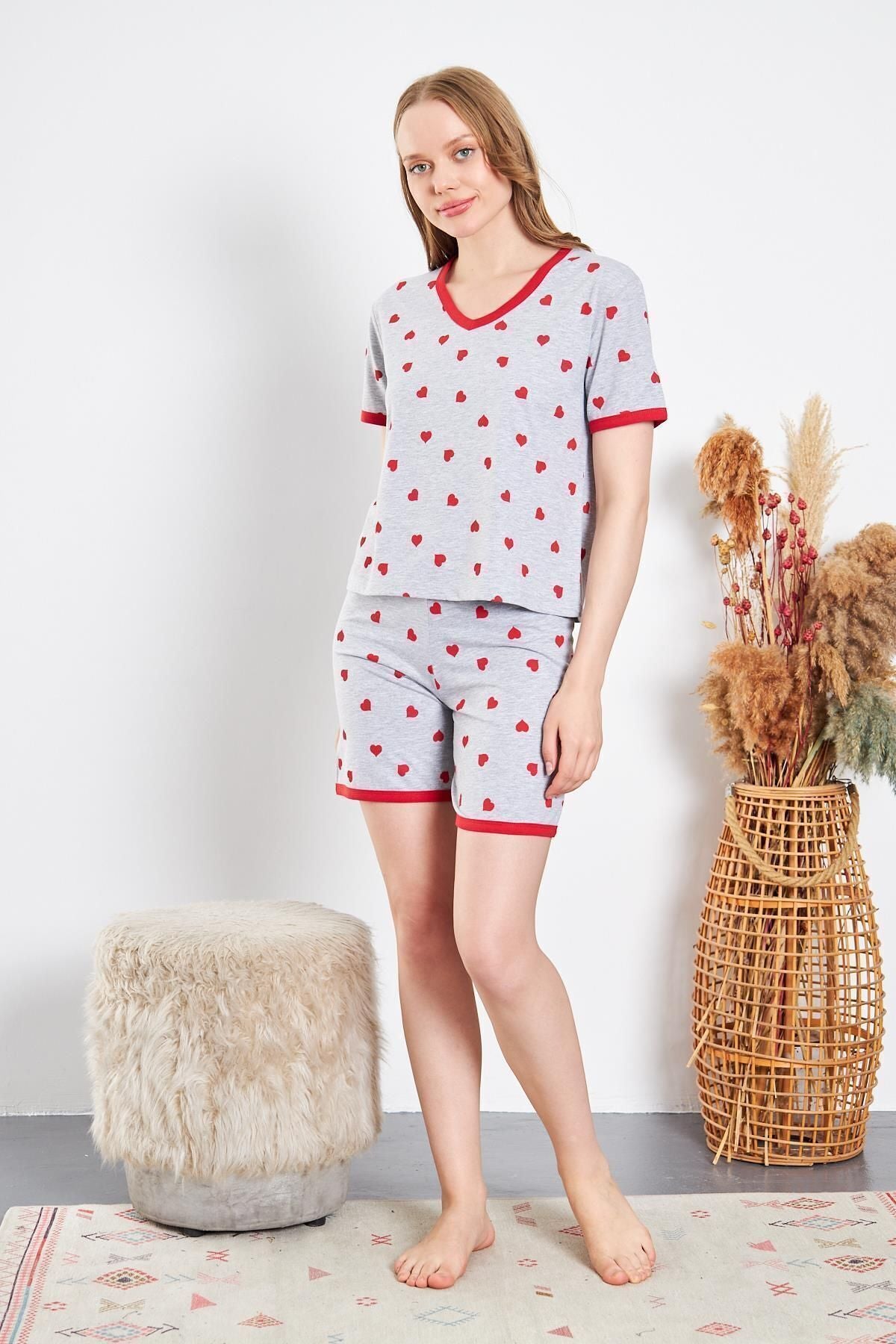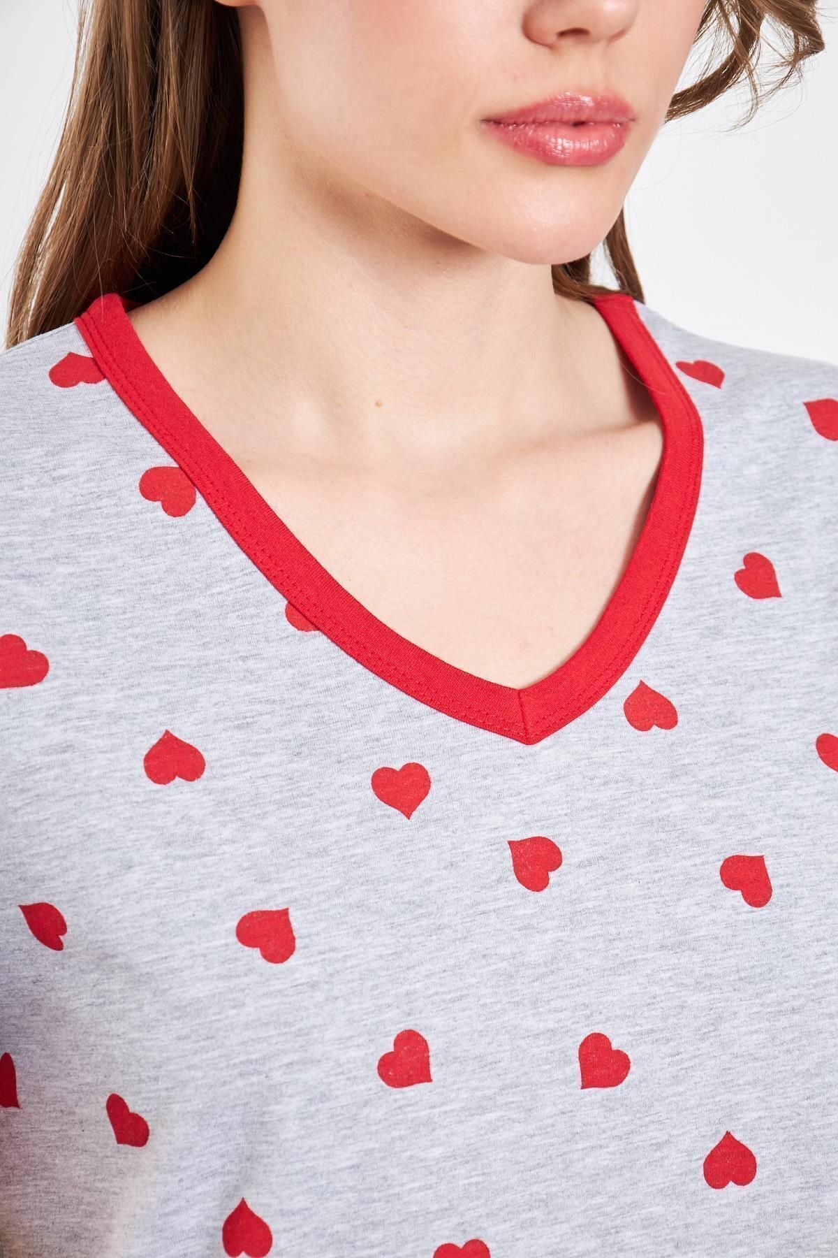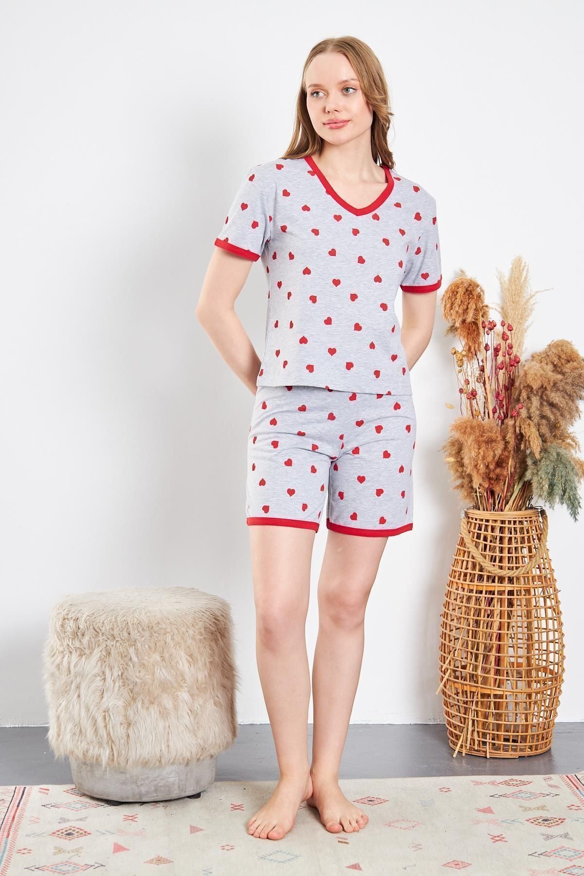 Kadın Pamuklu Örme Kırmızı Kalpli Şortlu Pijama Takımı