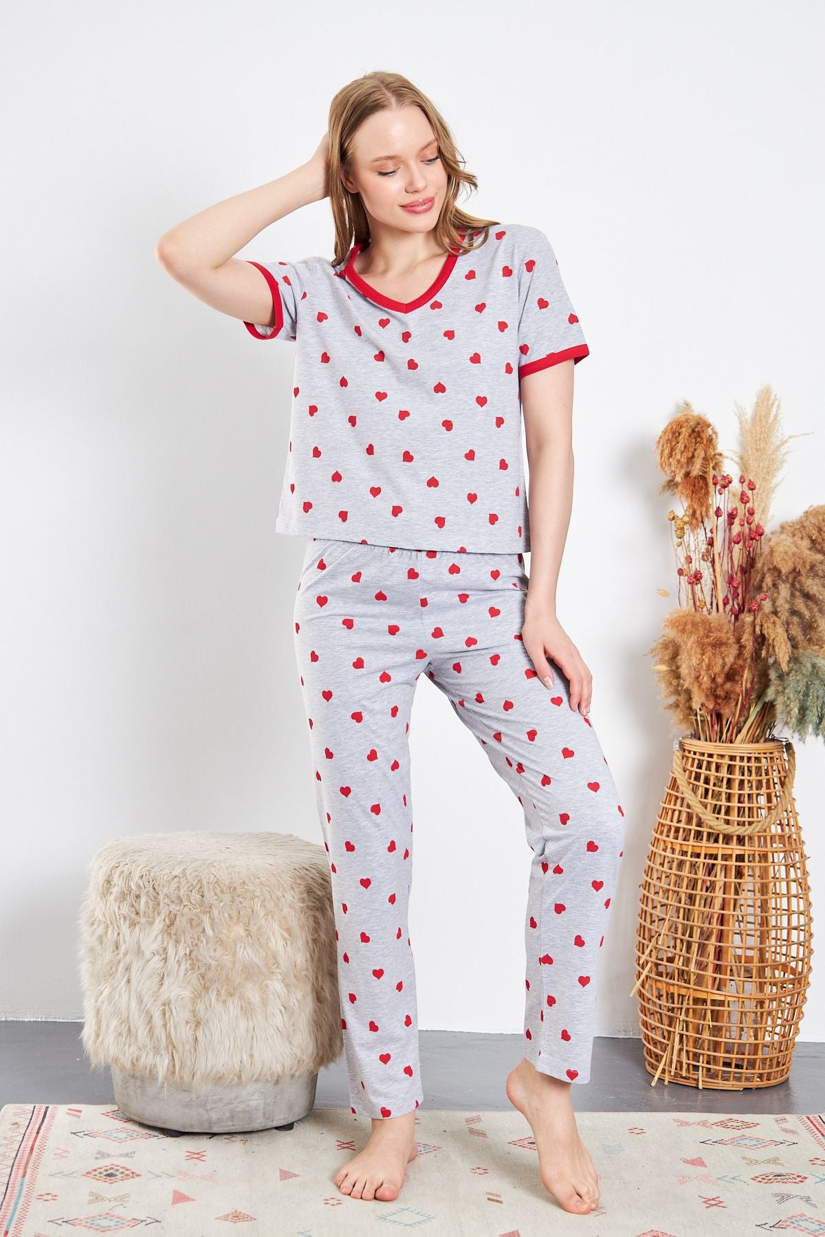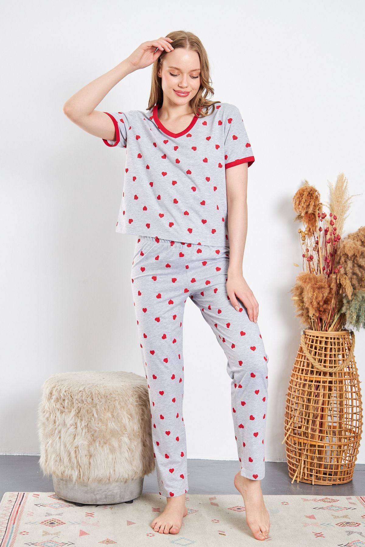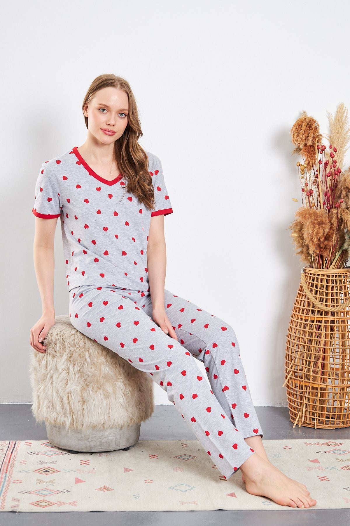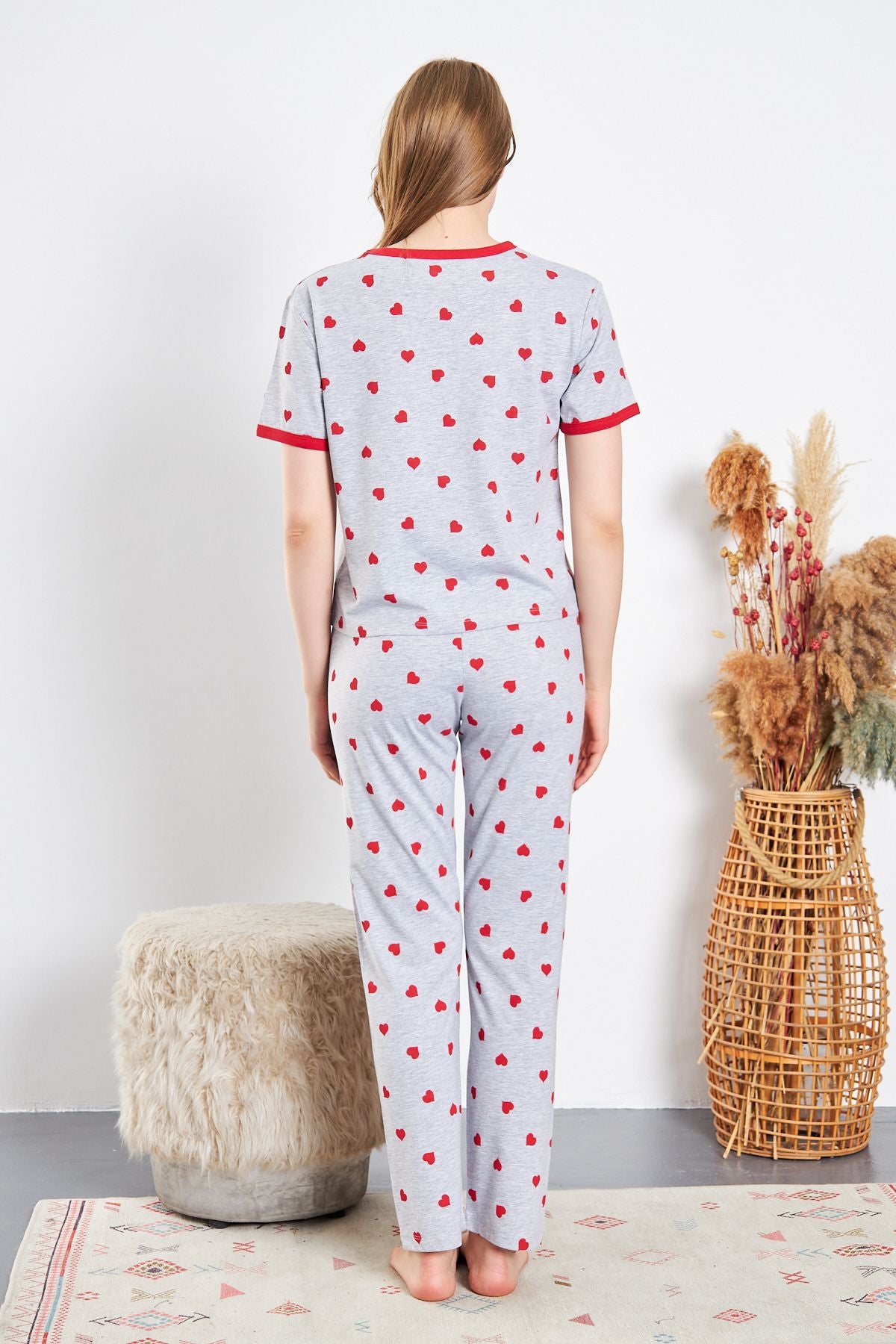GRİ ZEMİN KIRMIZI KALP DESENLİ