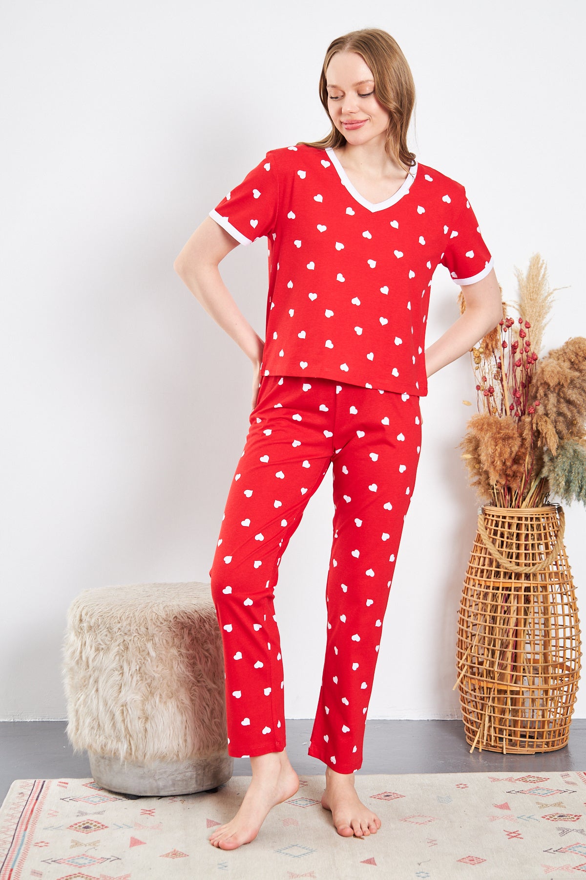 KIRMIZI ZEMİN BEYAZ KALP DESENLİ