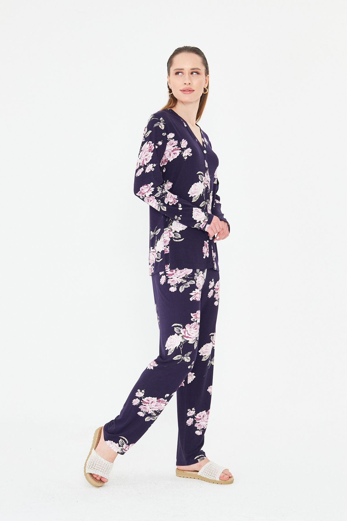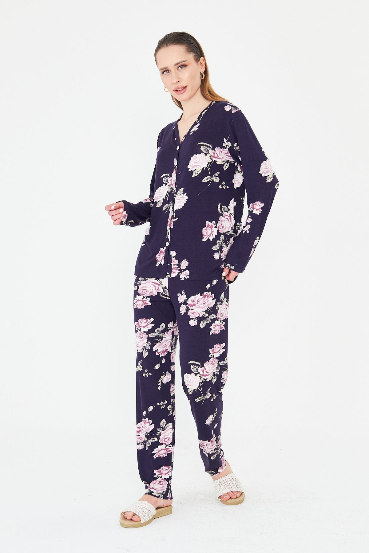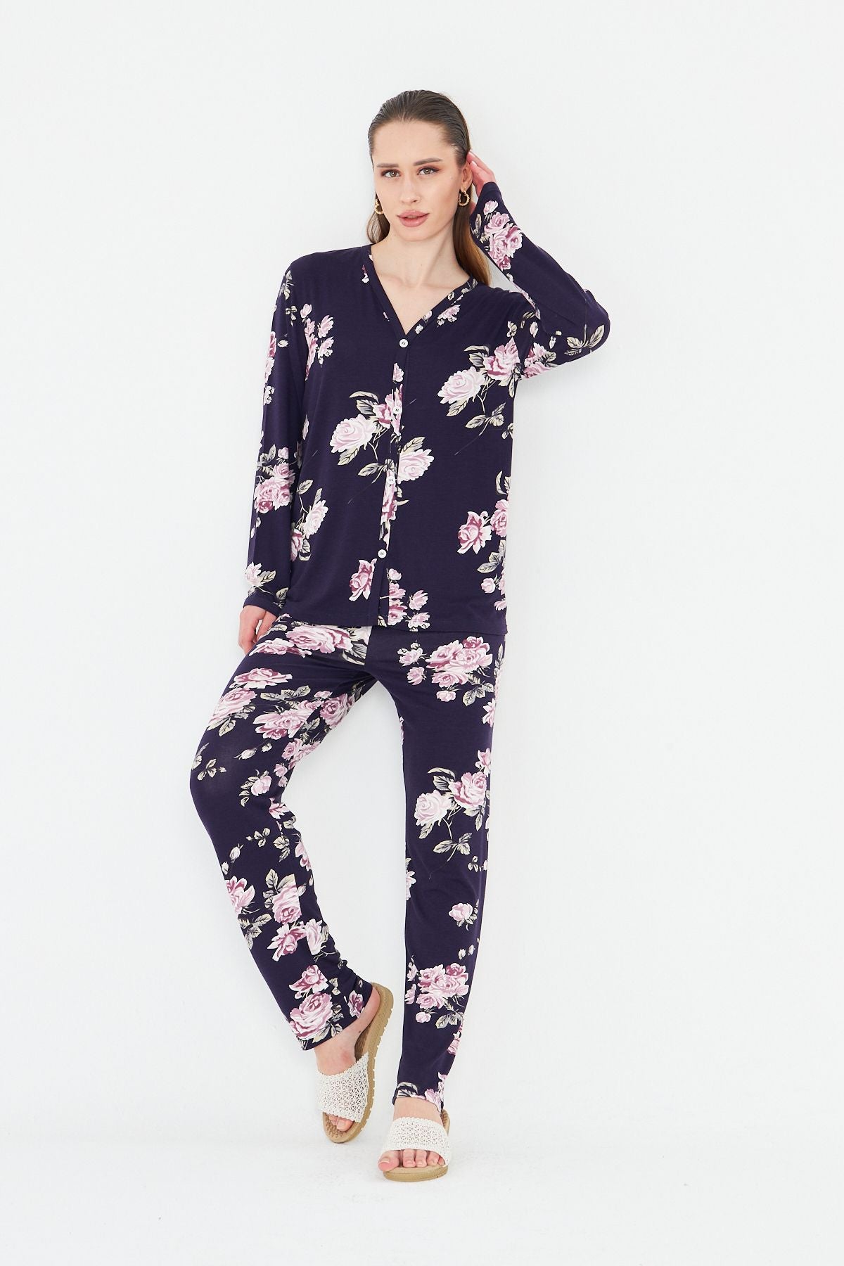 Kadın Gül Desenli V Yaka Düğmeli Pijama Takımı
