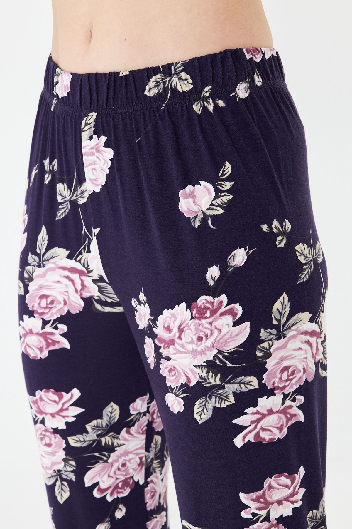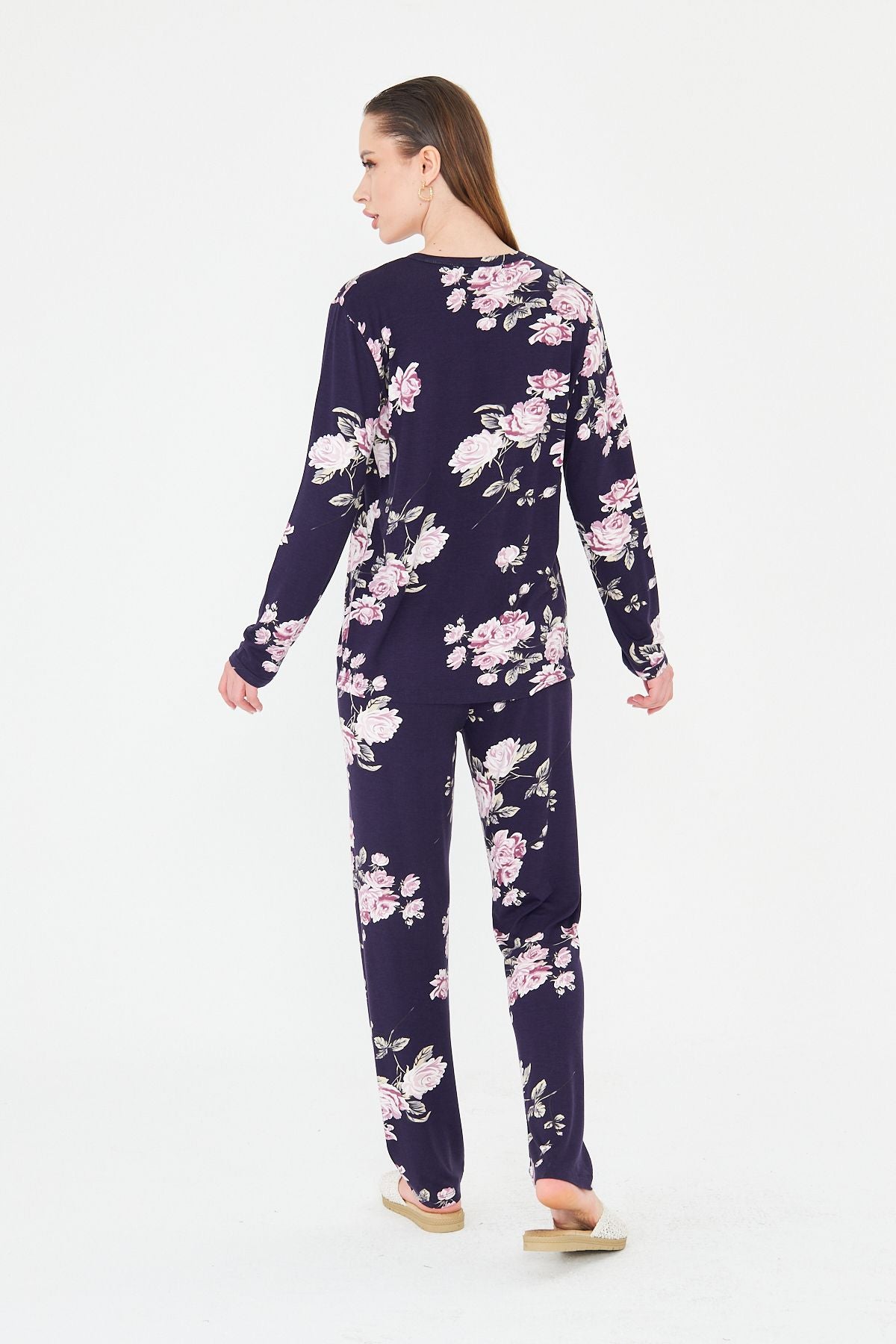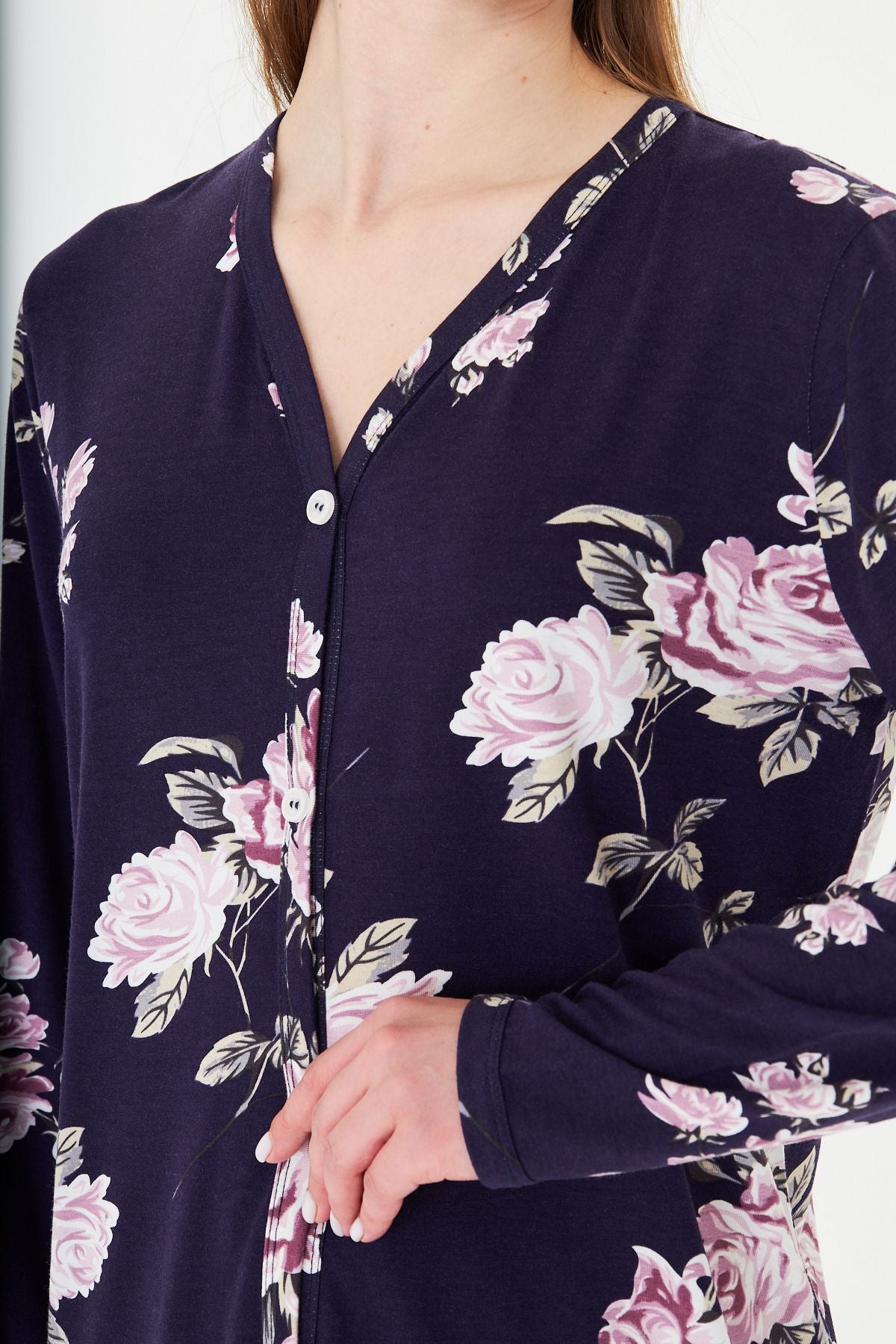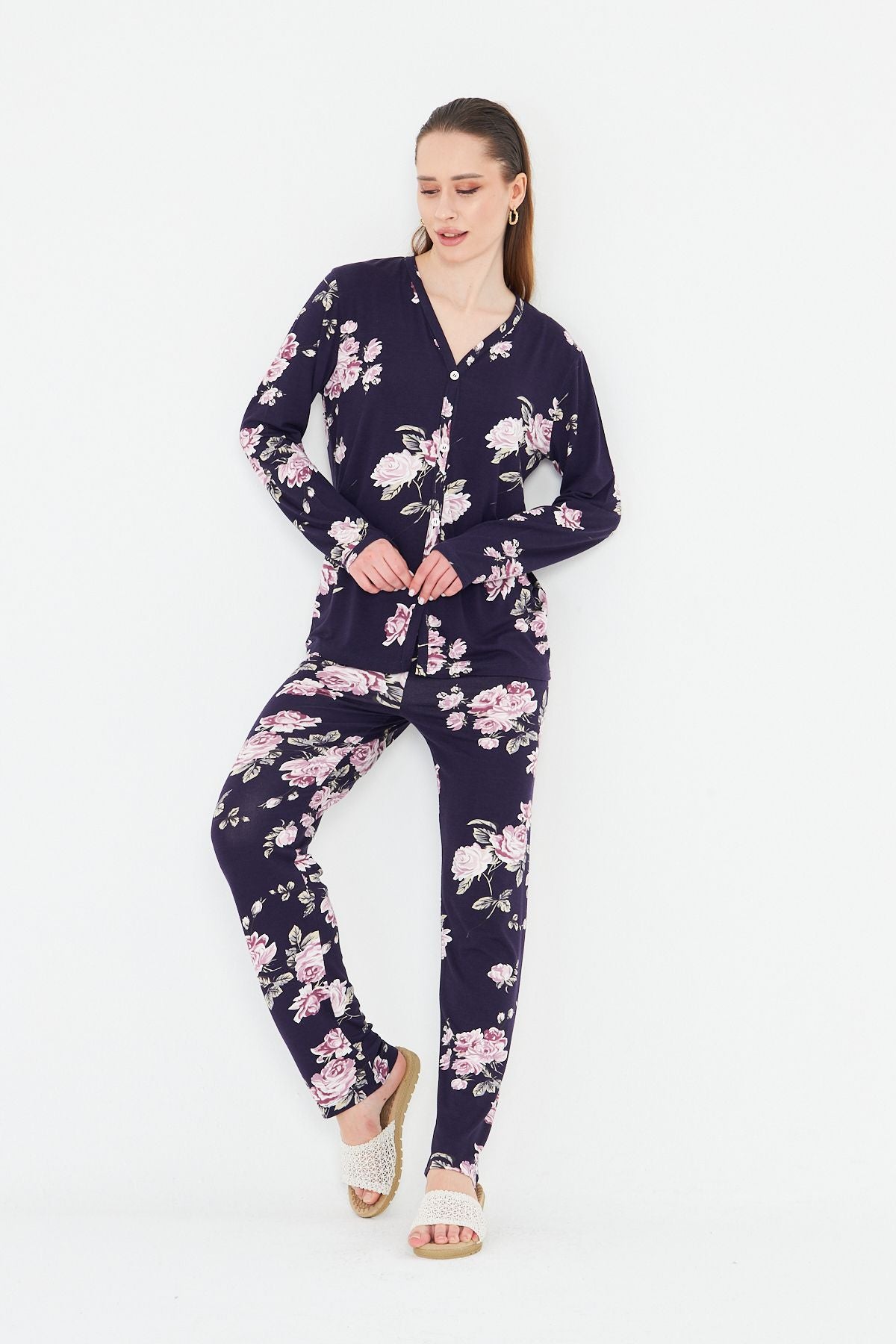 Kadın Gül Desenli V Yaka Düğmeli Pijama Takımı