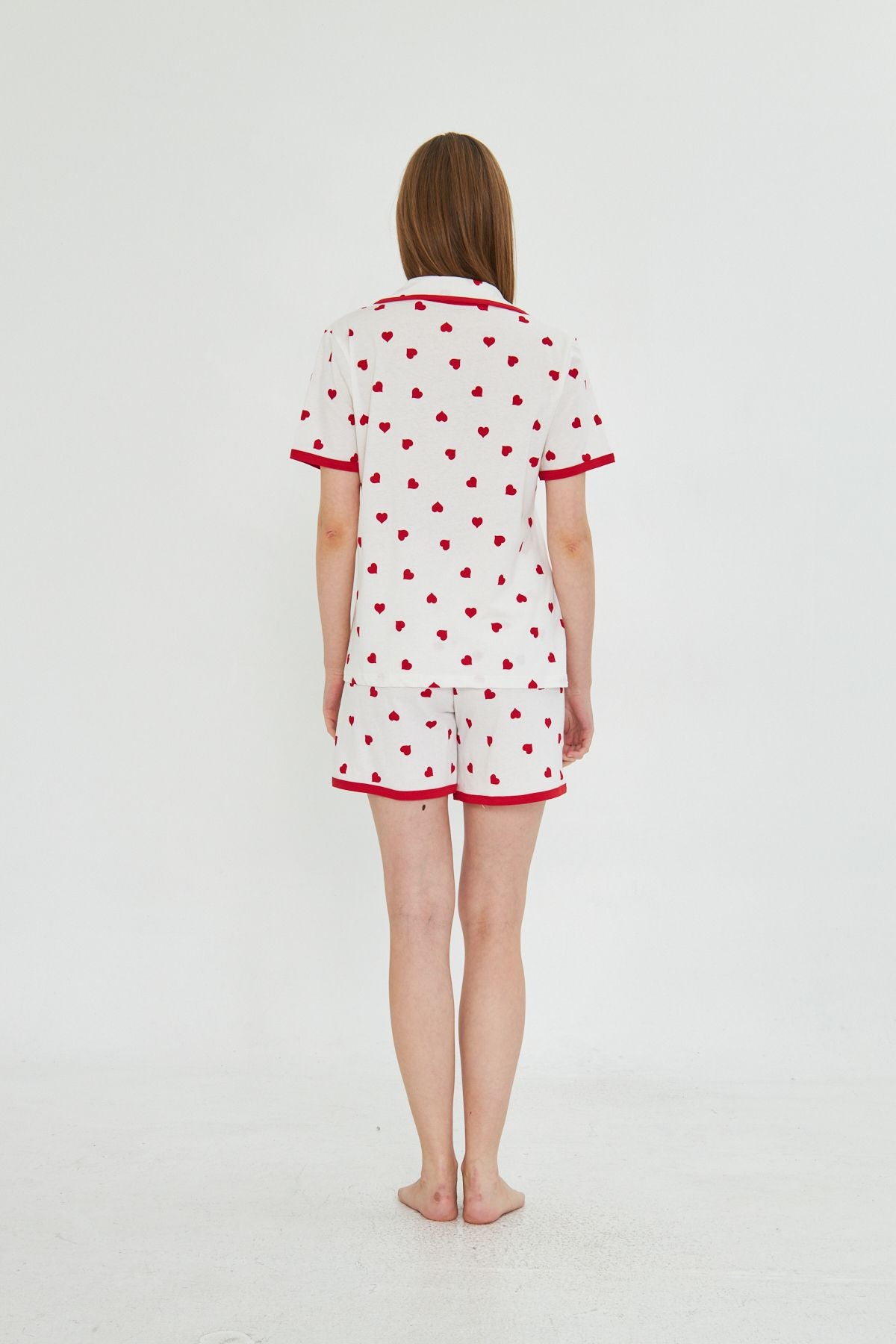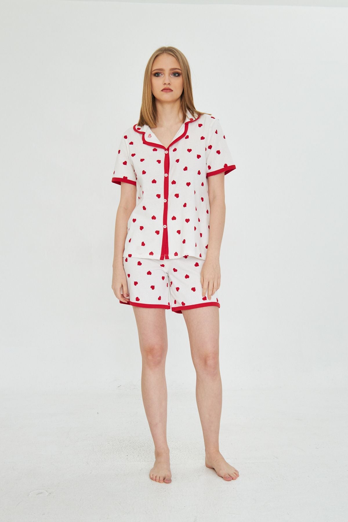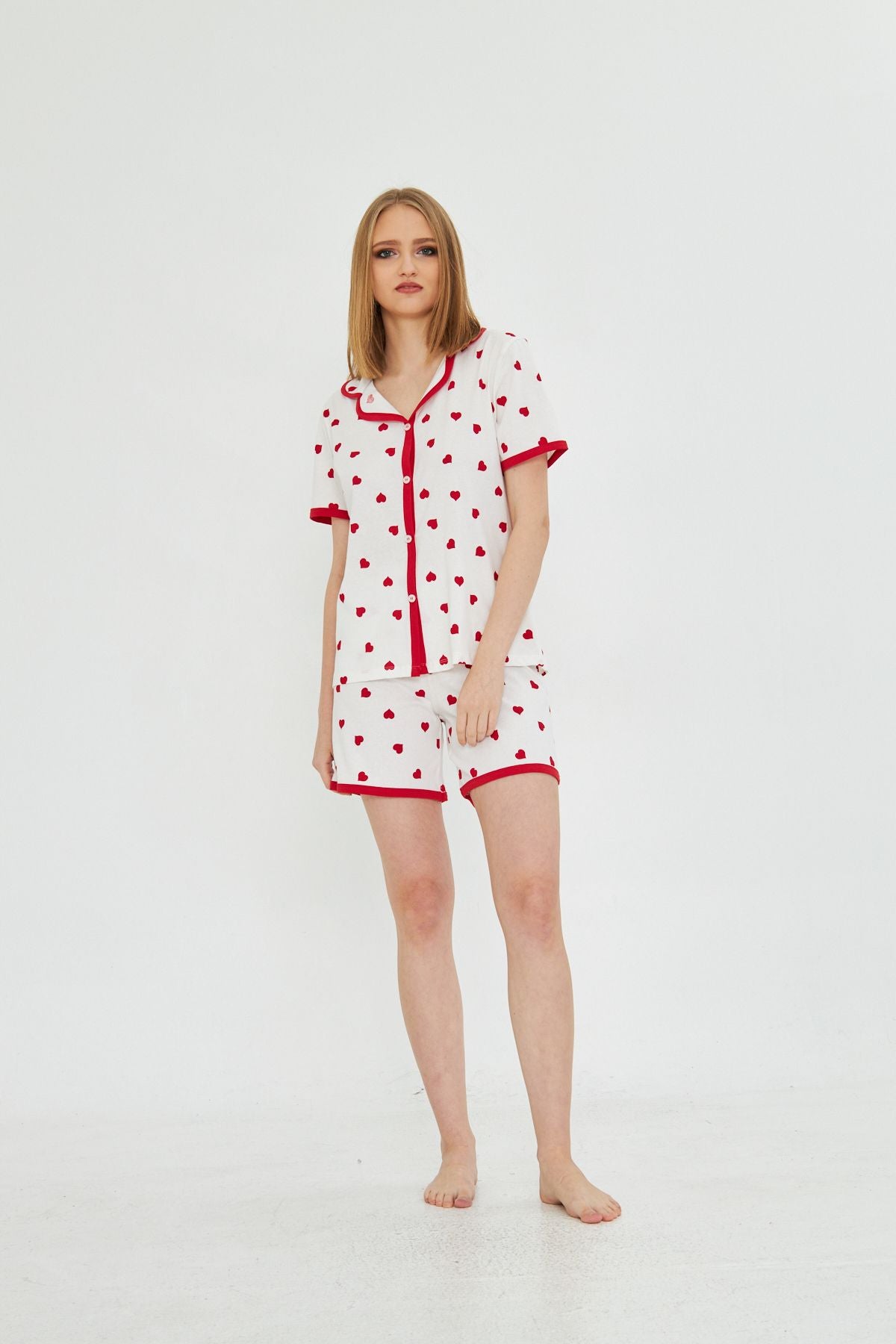 Kısa Kollu Önü Düğmeli Kalp Desenli Şortlu Pijama Takımı