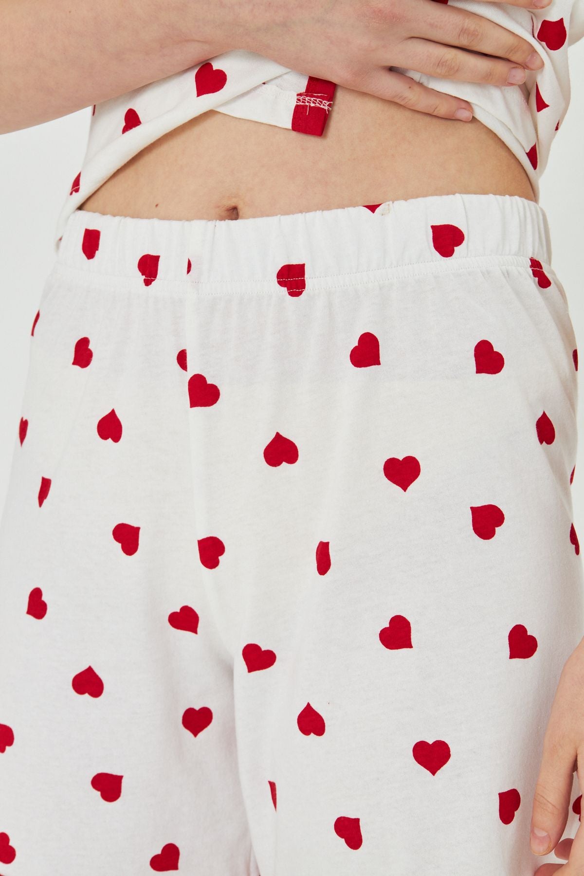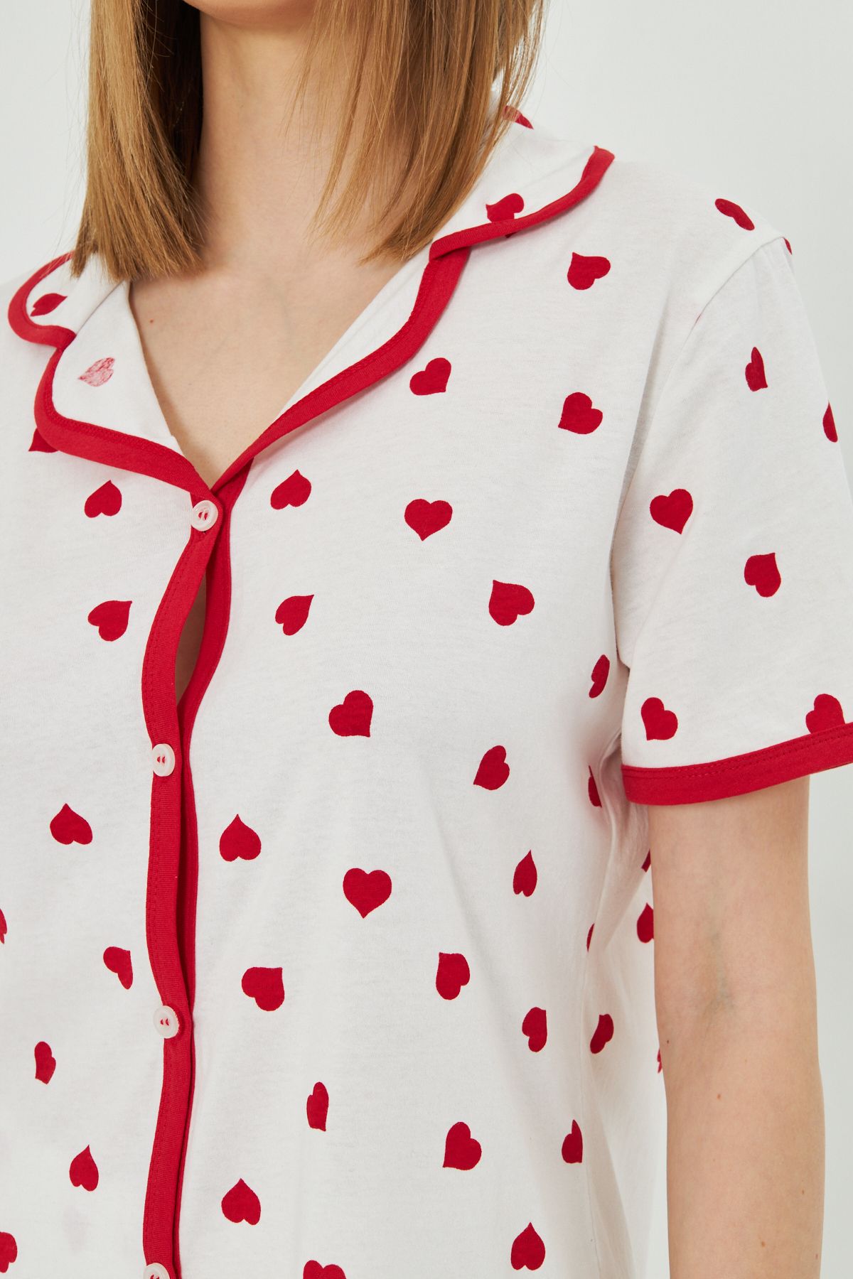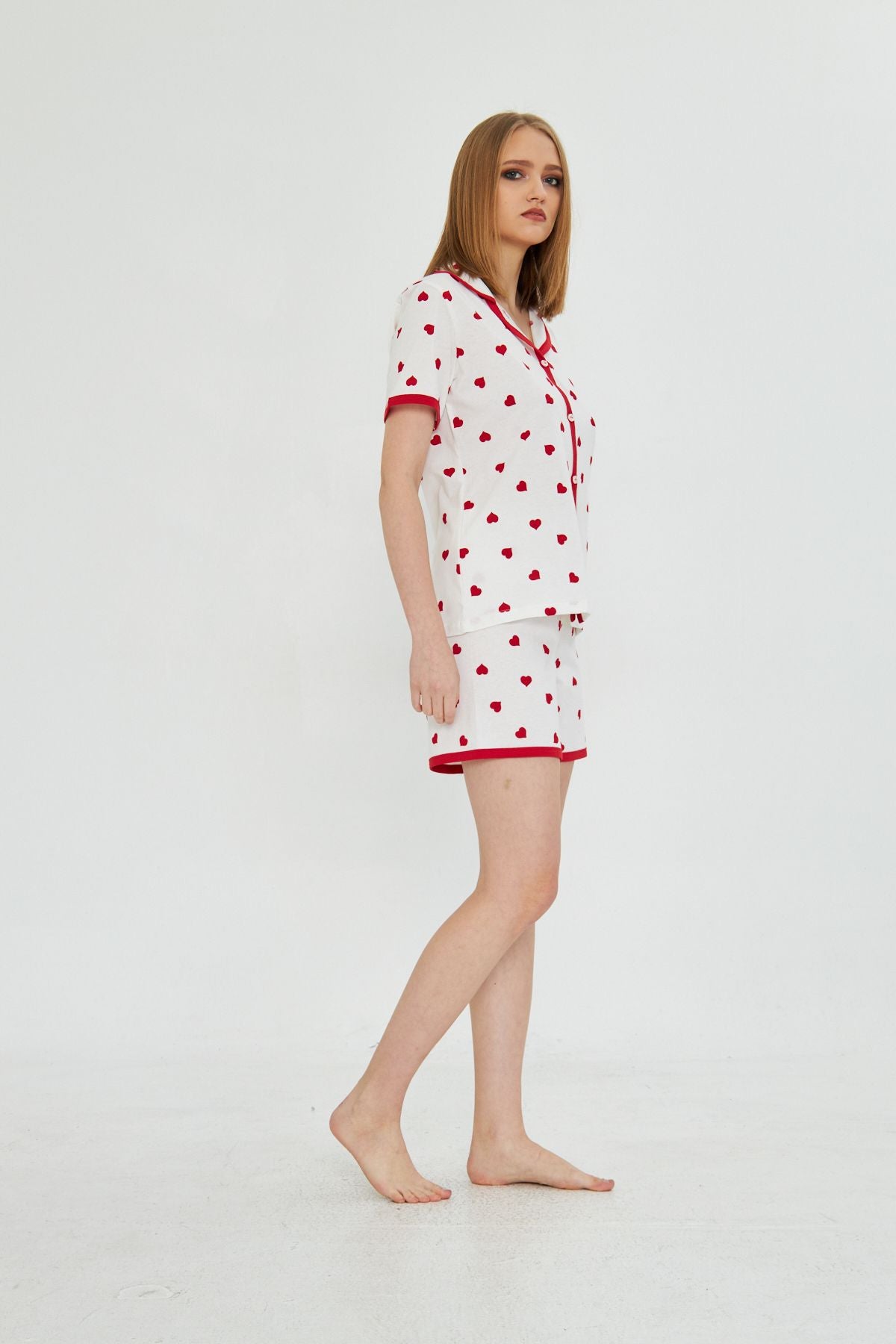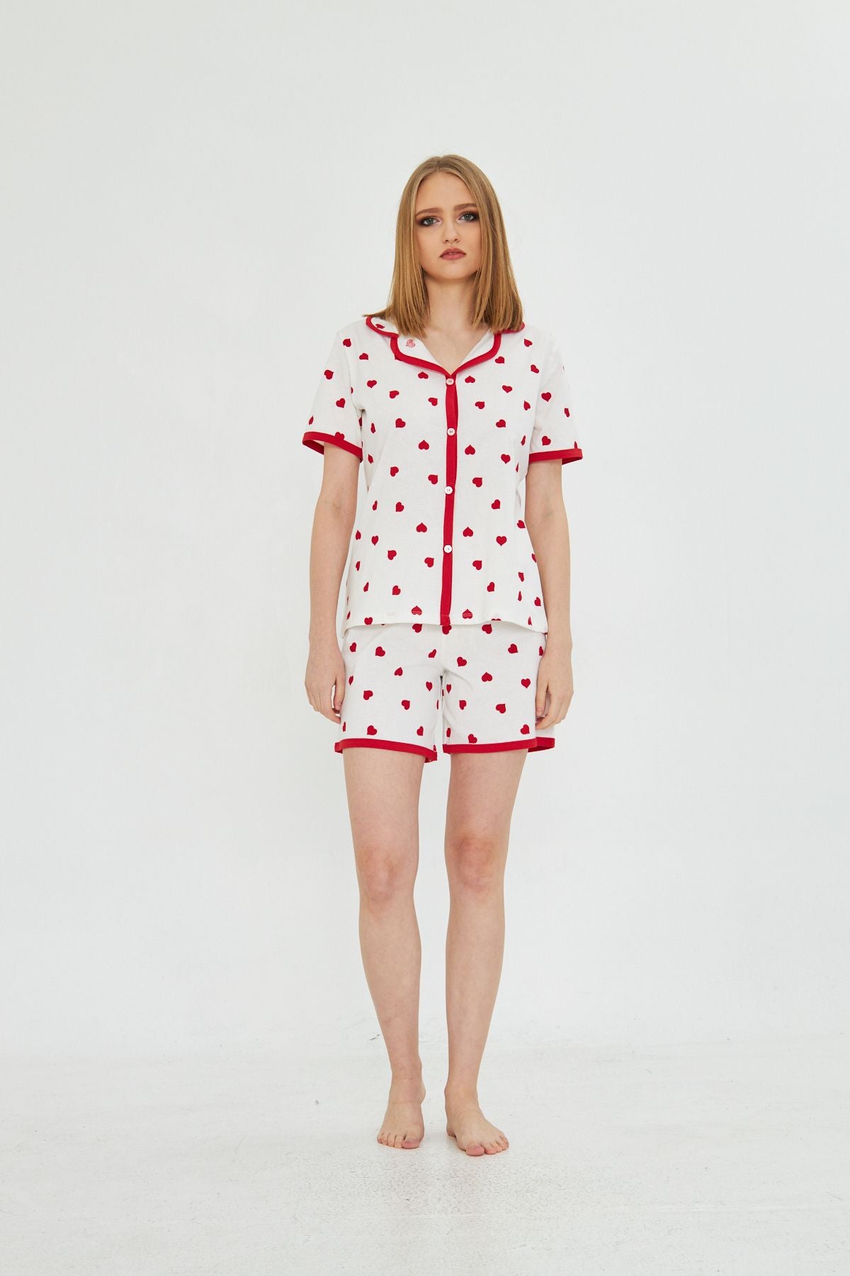 Kısa Kollu Önü Düğmeli Kalp Desenli Şortlu Pijama Takımı