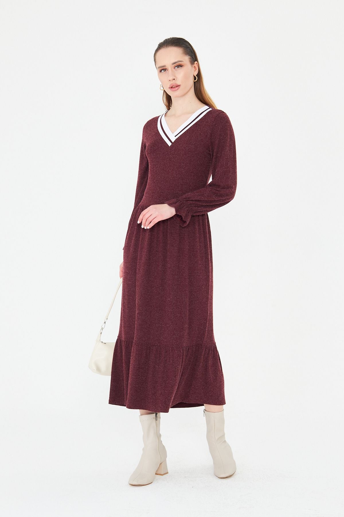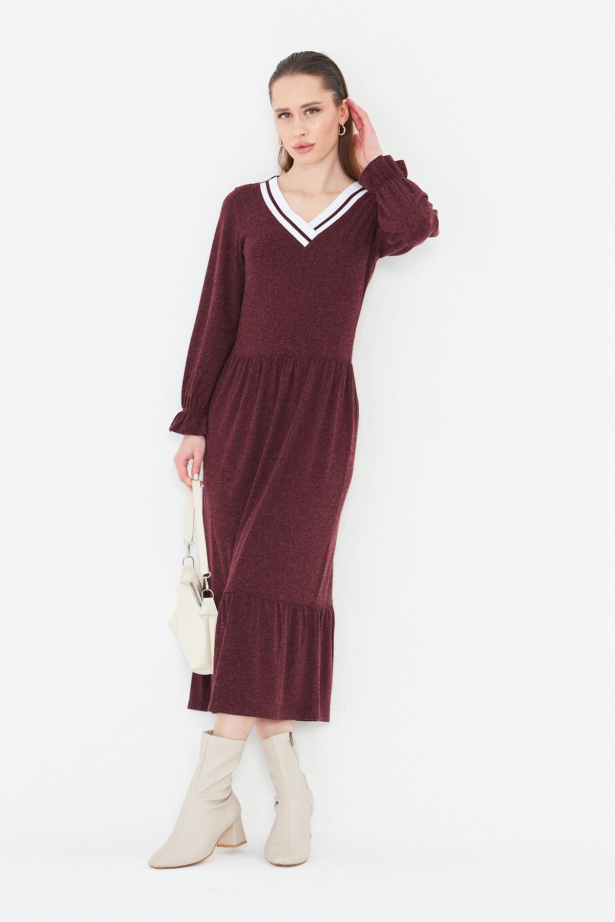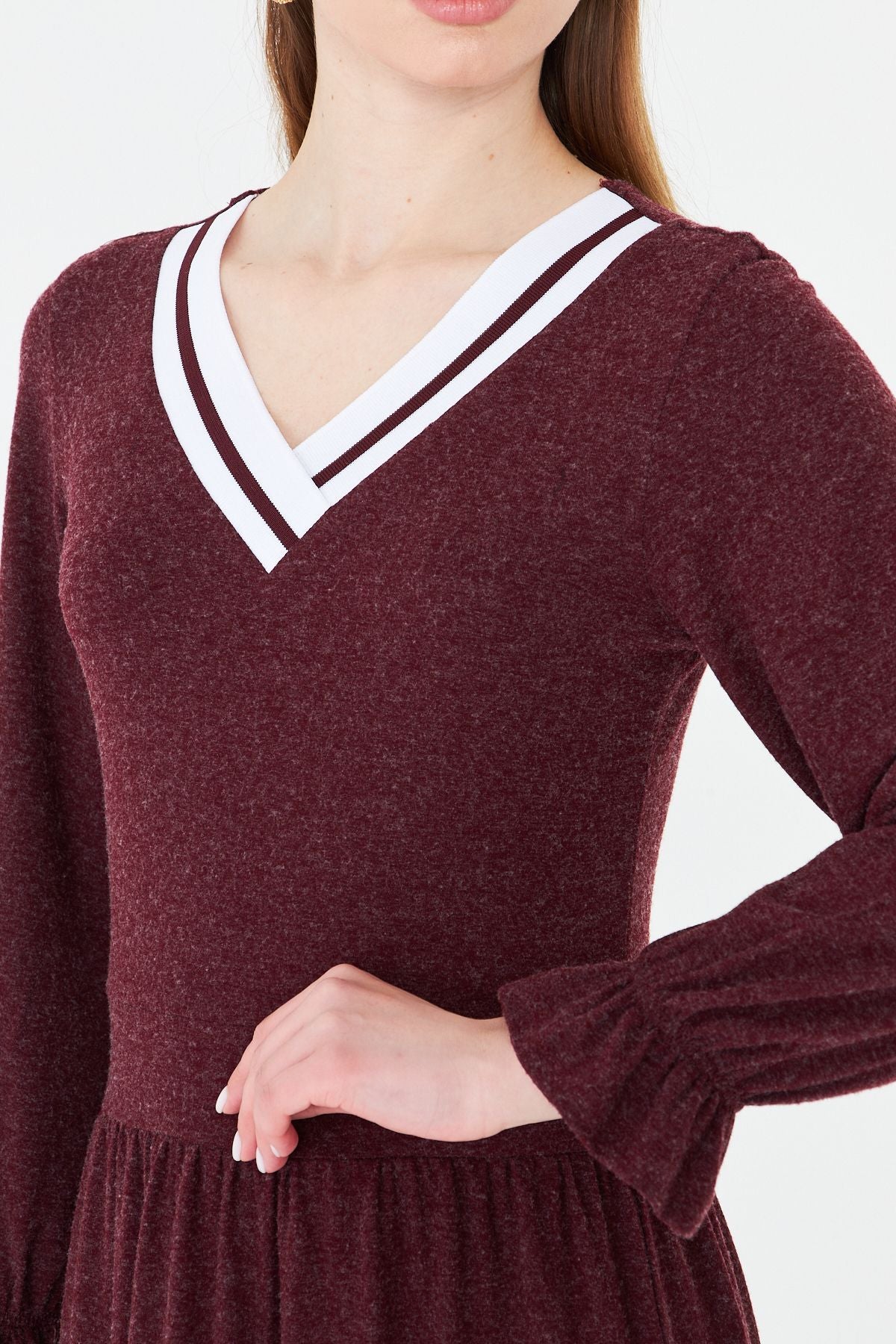 Kadın Uzun Kol Triko V Yakalı Yün Viskon Elbise